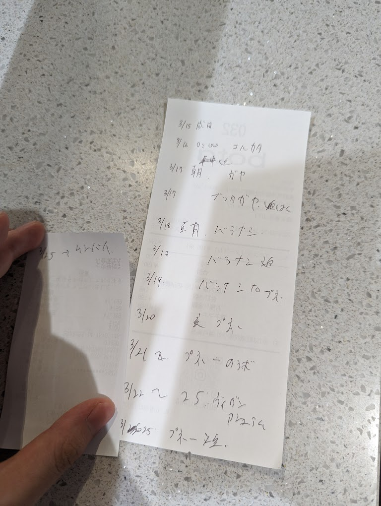 最後に余談ですが、この写真はインド出発の前日にバイトをしながら書いたものです。これからの旅ブログでは載っている地名が数々登場するかもしれません。いきあたりばったりの旅だったのですべてが登場するかわわかりませんが、どうぞお楽しみに!